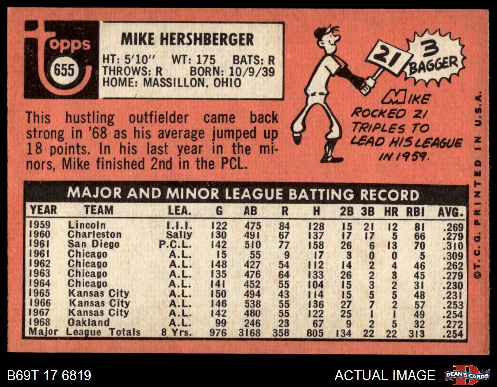 1969 Topps #655 Mike Hershberger 4 - VG/EX