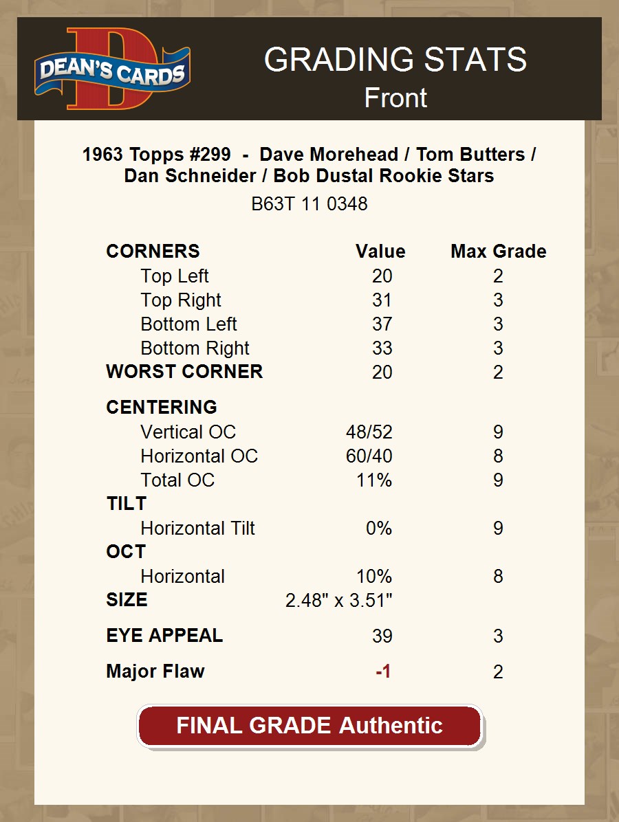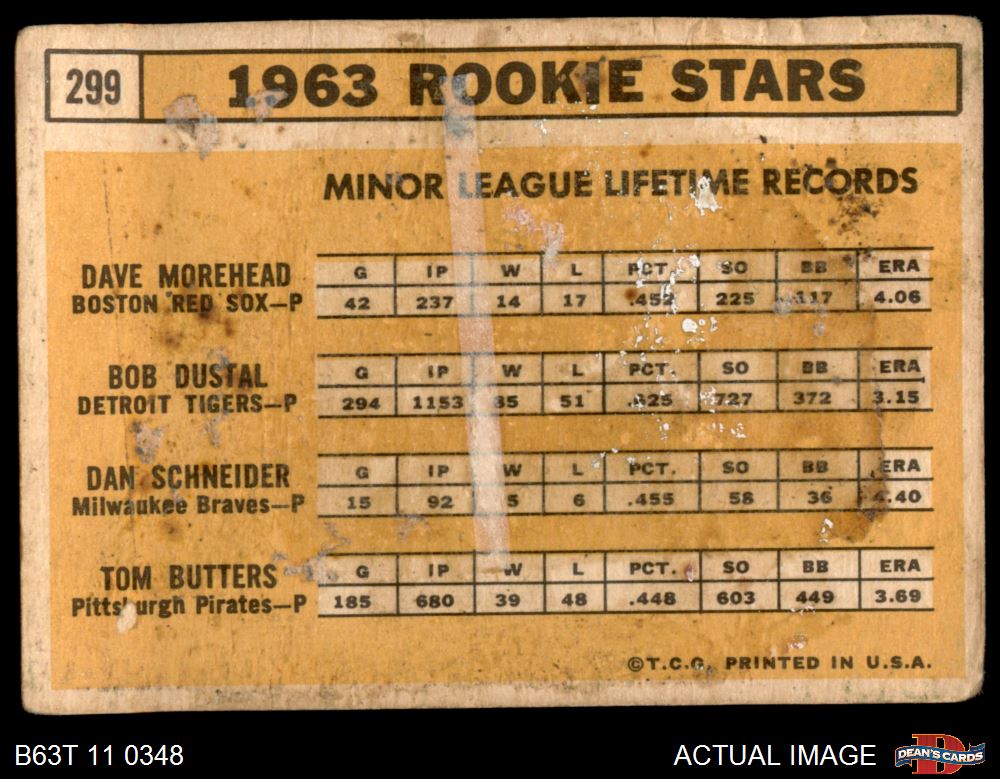 1963 Topps #299 - Dave Morehead / Tom Butters / Dan Schneider / Bob Dustal Rookie Stars AUTHENTIC