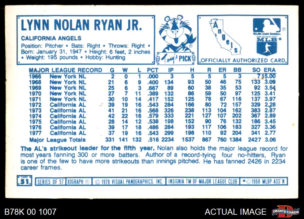 1978 Kellogg's #51 Nolan Ryan 2 - GOOD