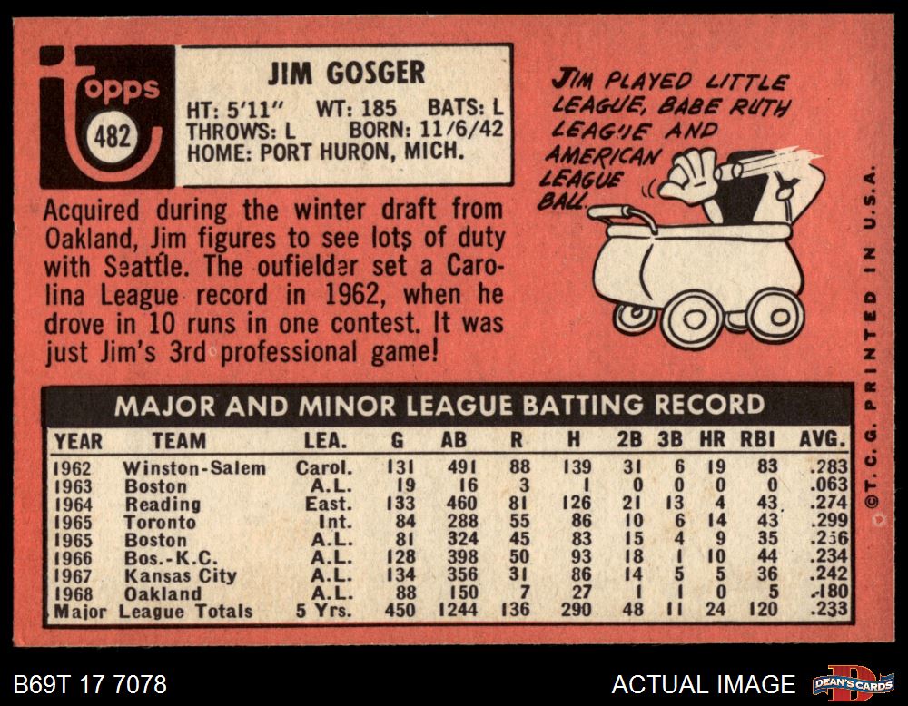 1969 Topps #482 YN Jim Gosger 5 - EX