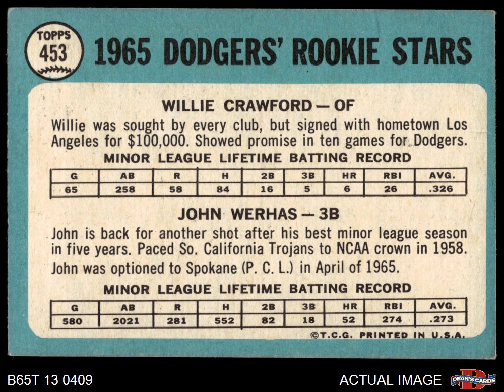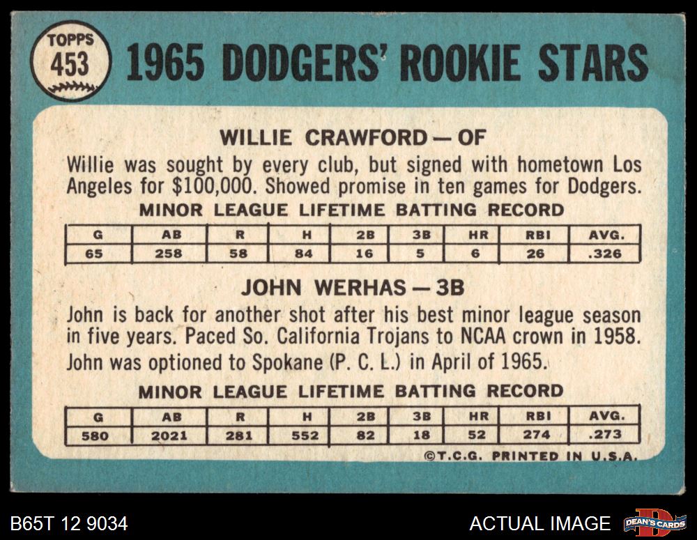 1965 Topps #453 - Willie Crawford / John Werhas Dodgers Rookies 3 - VG
