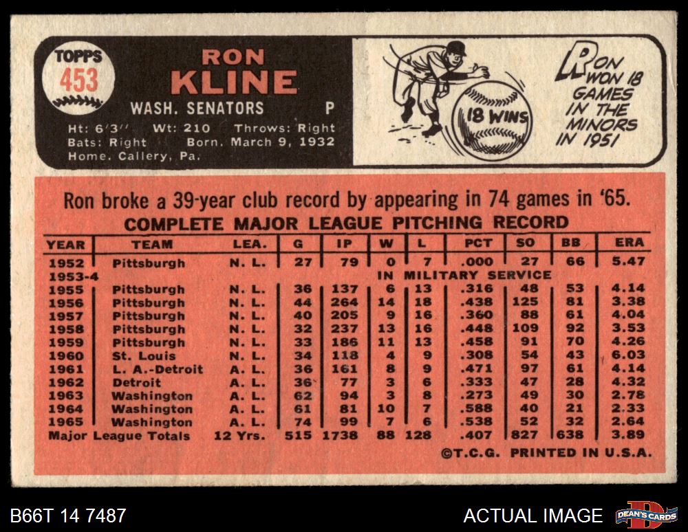 1966 Topps #453 Ron Kline 2 - GOOD