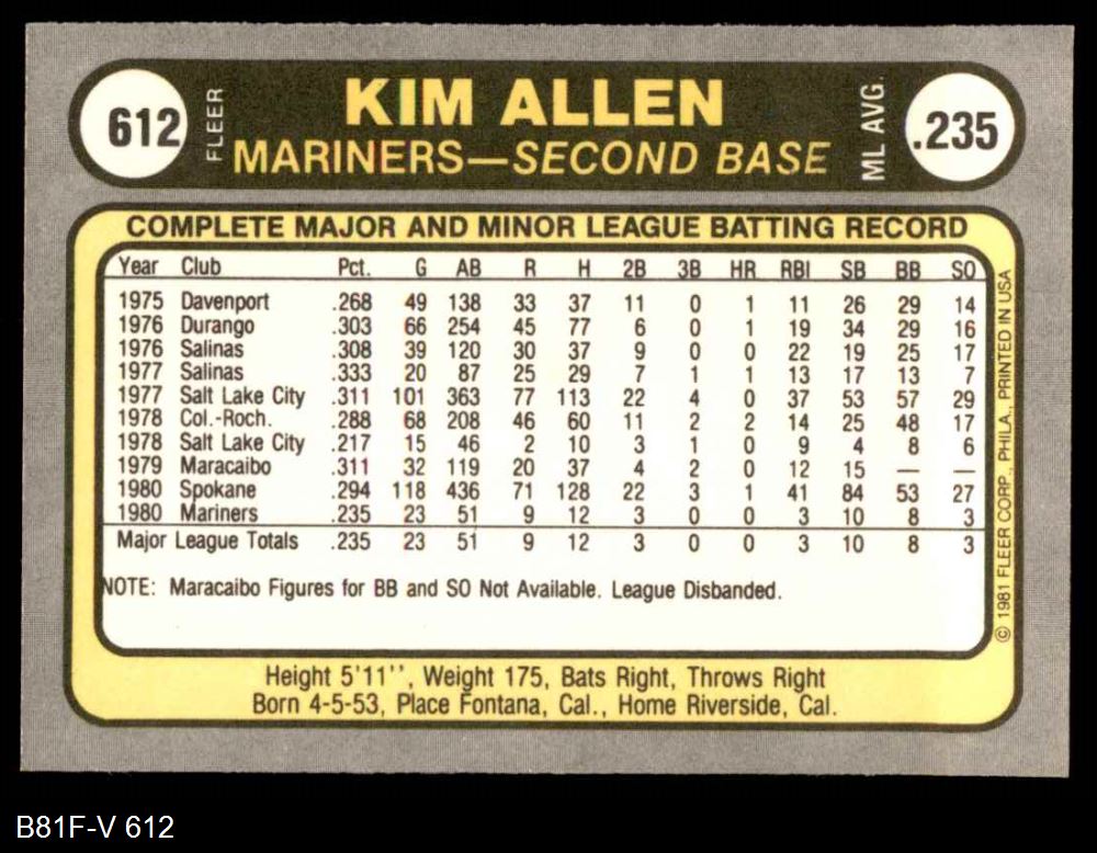 1981 Fleer #612 Kim Allen