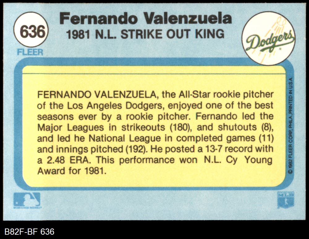 1982 Fleer #636 COR Fernando Valenzuela 8 - NM/MT