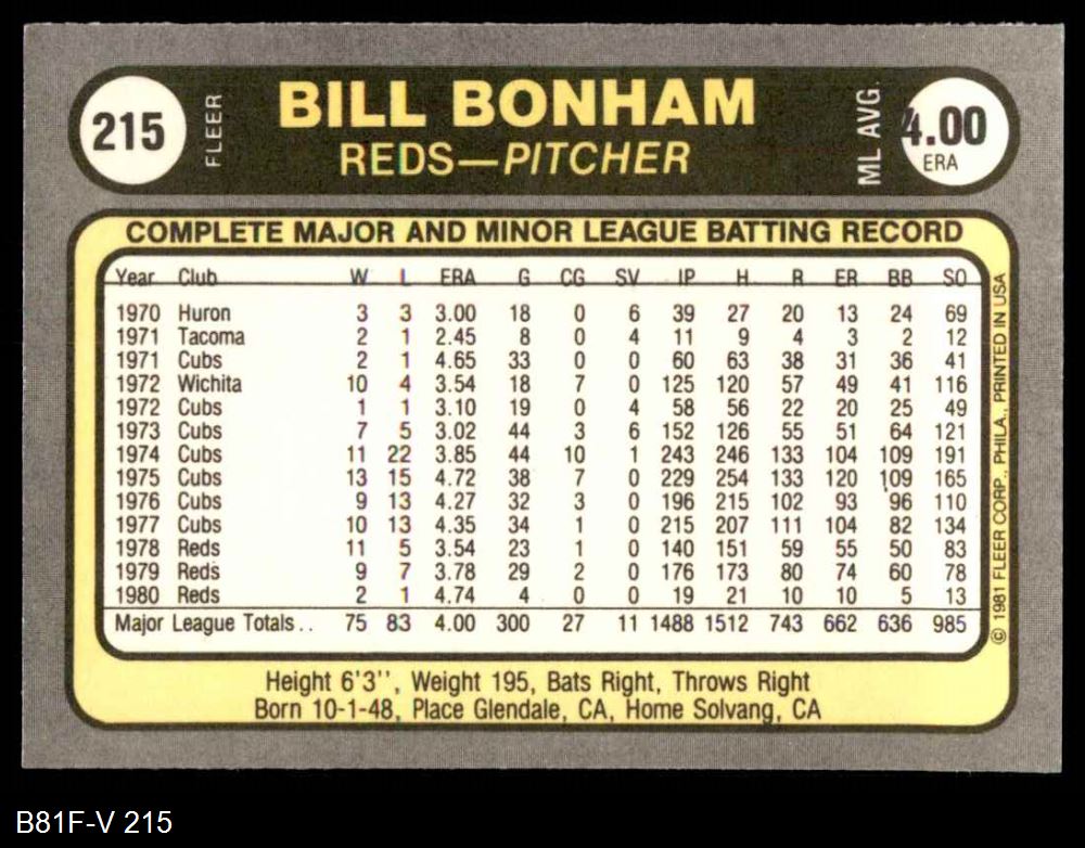 1981 Fleer #215 xHAND Bill Bonham