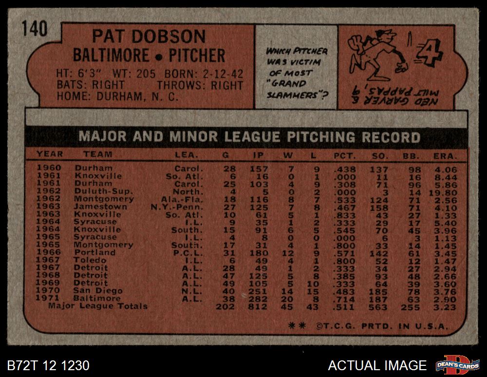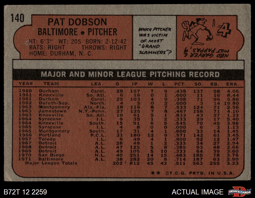 1972 Topps #140 Pat Dobson 2 - GOOD