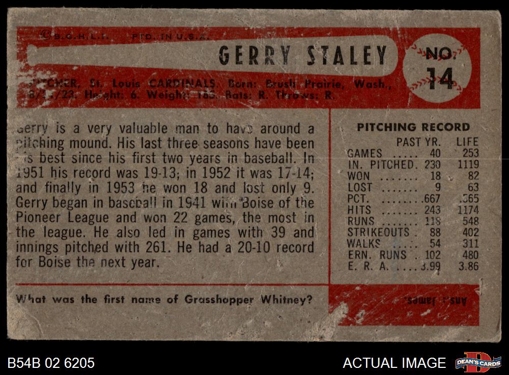 1954 Bowman #14 Gerry Staley 1 - POOR