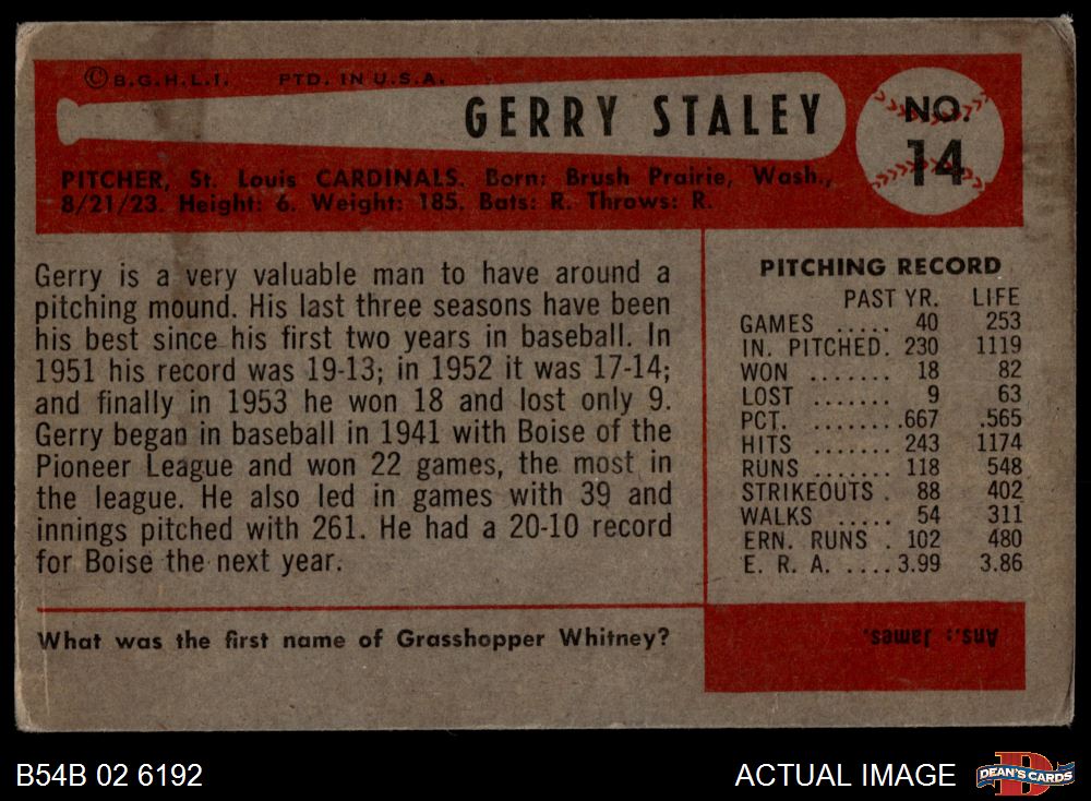 1954 Bowman #14 Gerry Staley 3 - VG