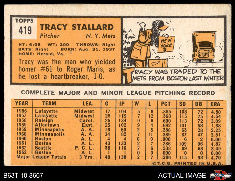 1963 Topps #419 Tracy Stallard 3 - VG