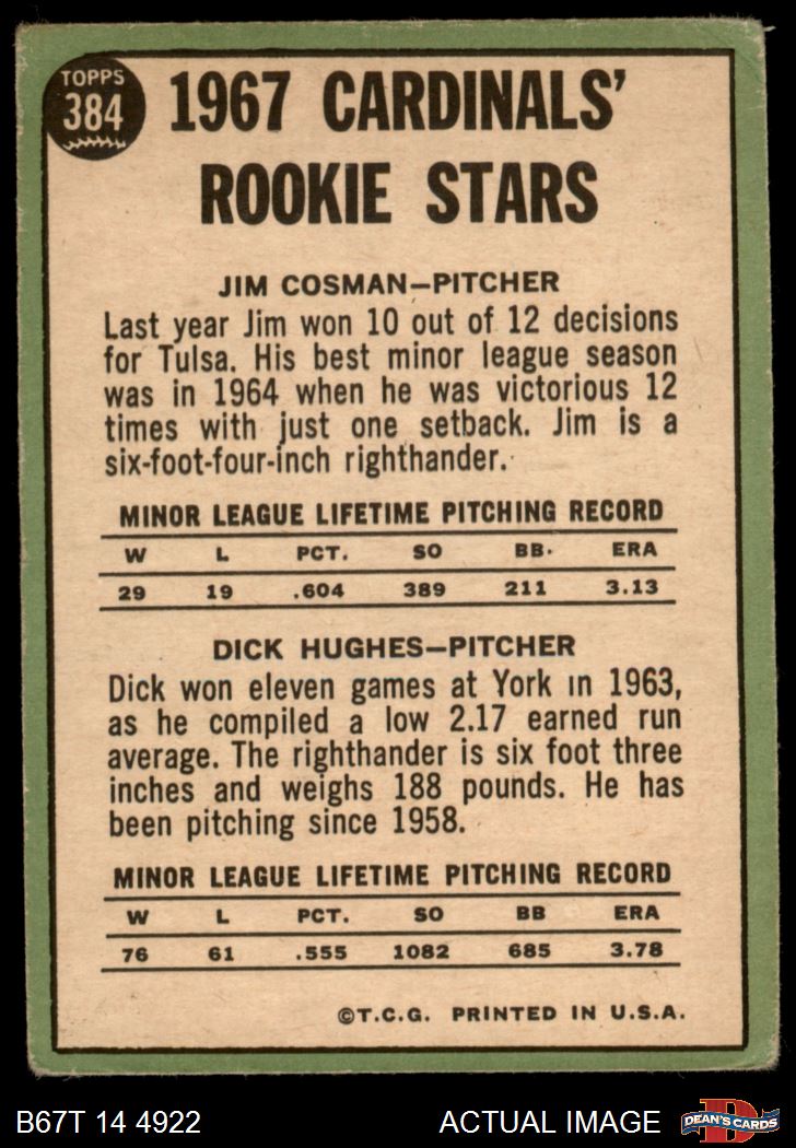 1967 Topps #384 - Dick Hughes / Jim Cosman Cardinals Rookies 1 - POOR