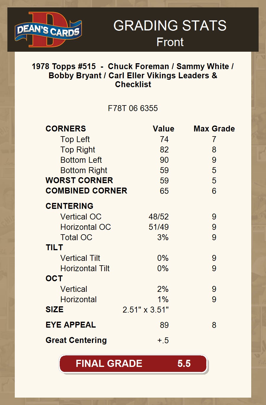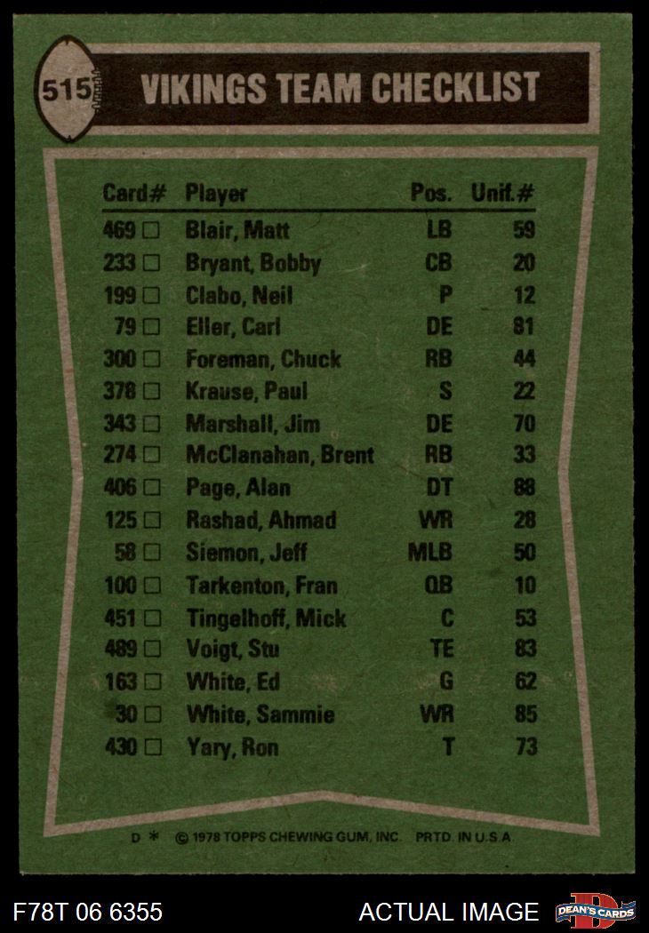 1978 Topps #515 - Chuck Foreman / Sammy White / Bobby Bryant / Carl Eller Vikings Leaders & Checklist 5.5 - EX+