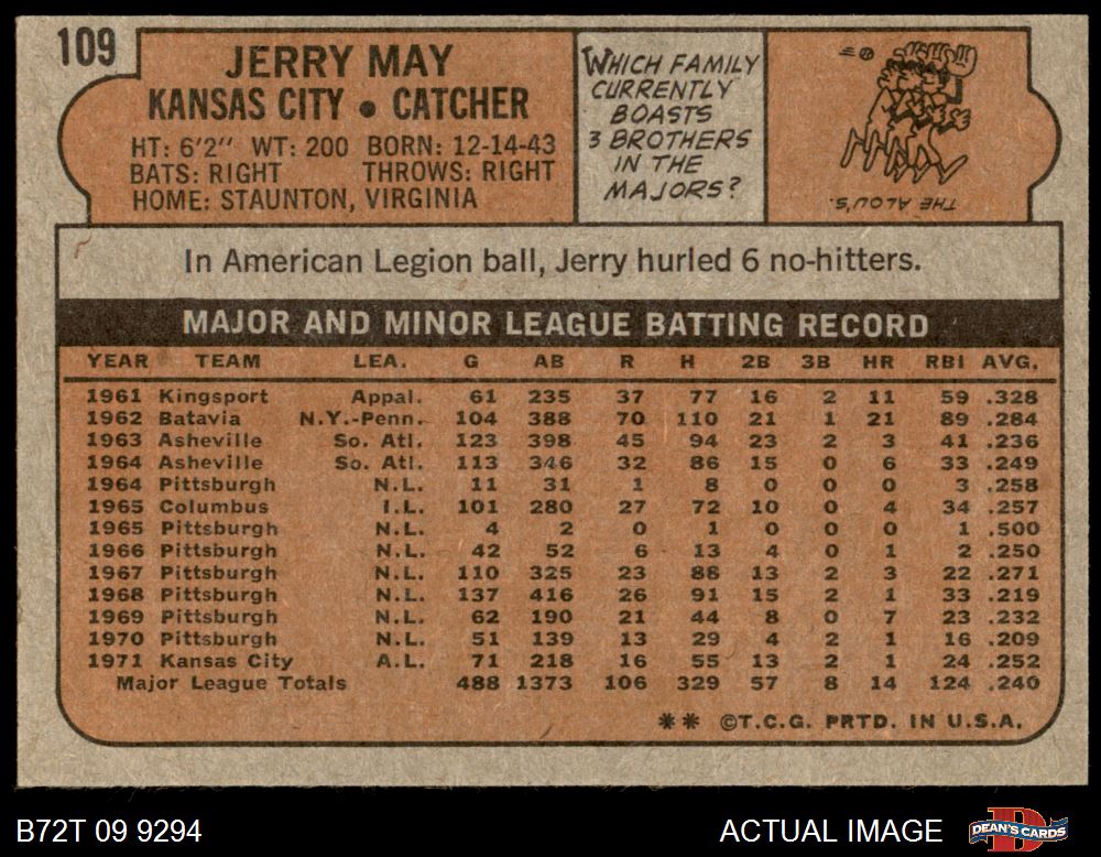 1972 Topps #109 Jerry May 5 - EX