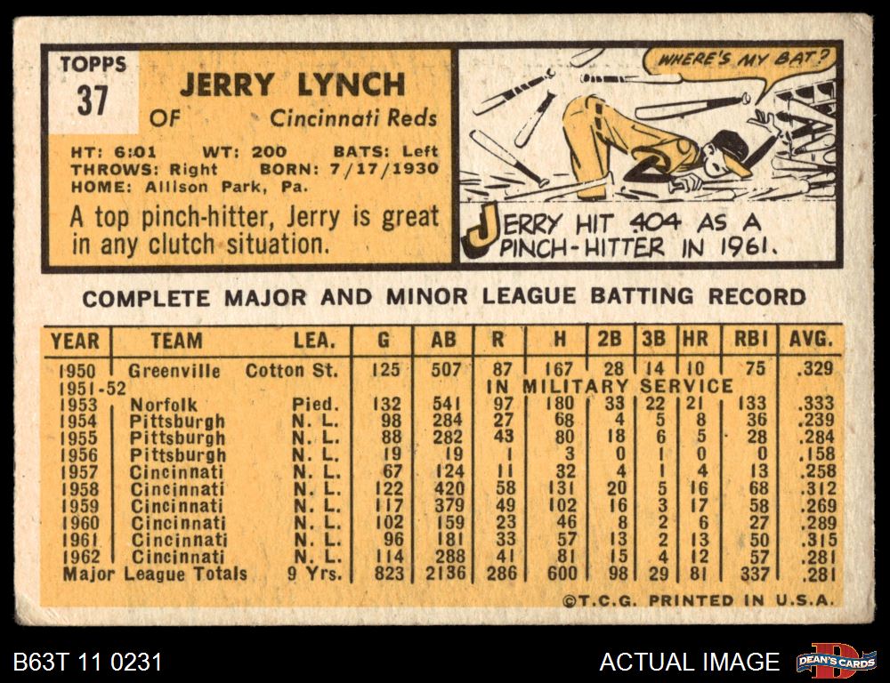 1963 Topps #37 Jerry Lynch 1.5 - FAIR