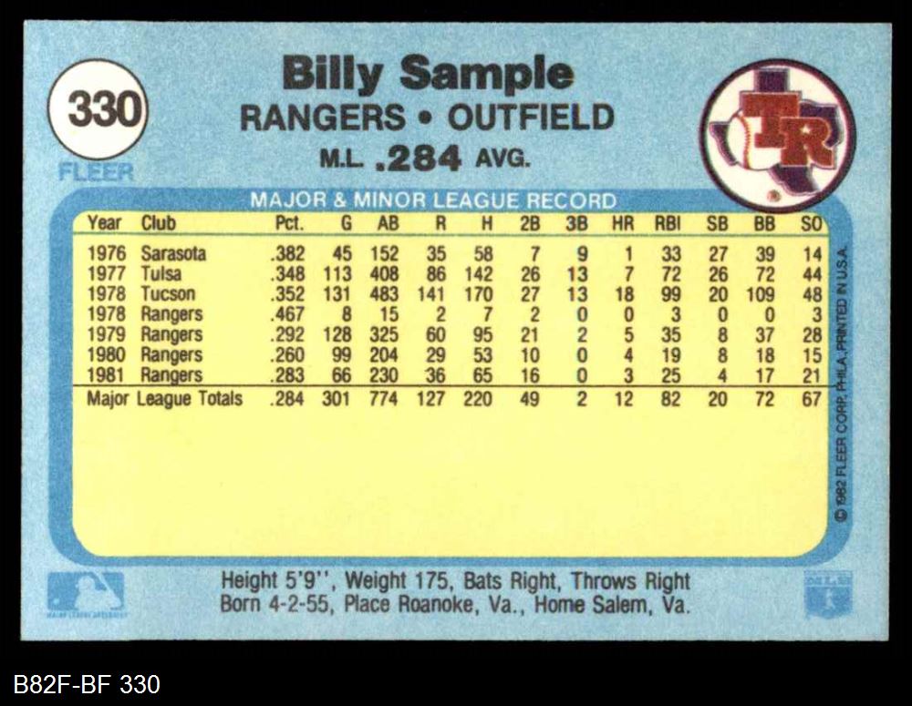 1982 Fleer #330 Billy Sample 8 - NM/MT