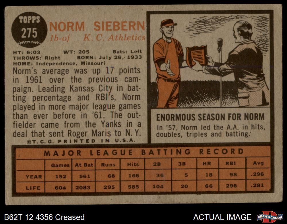 1962 Topps #275 Norm Siebern Front Thumbnail