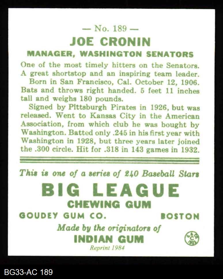 1933 Goudey Reprint #189 Joe Cronin 8 - NM/MT