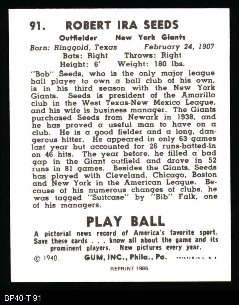 1940 Play Ball Reprint #91 Bob Seeds 8 - NM/MT