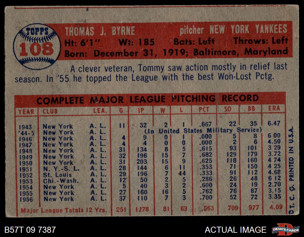 1957 Topps #108 Tommy Byrne 2 - GOOD