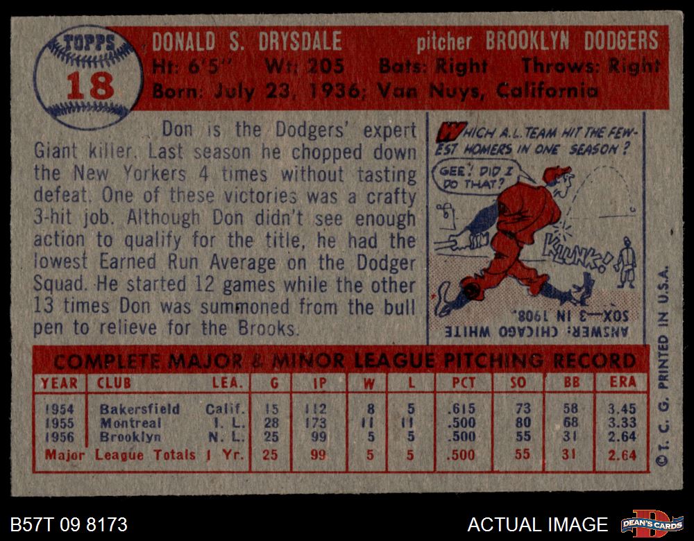 1957 Topps #18 Don Drysdale 3 - VG