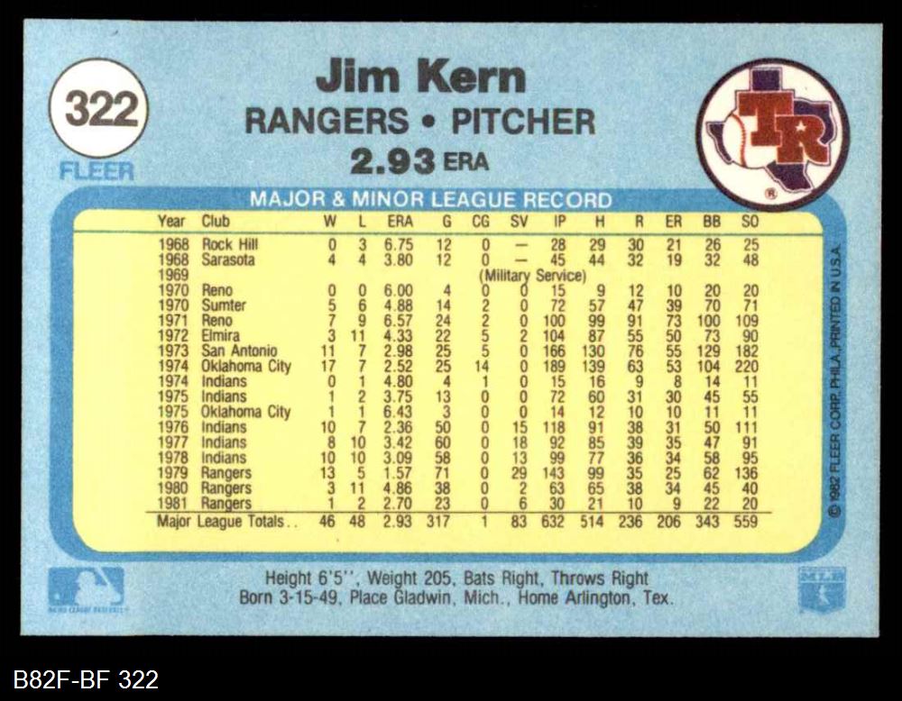 1982 Fleer #322 Jim Kern 8 - NM/MT