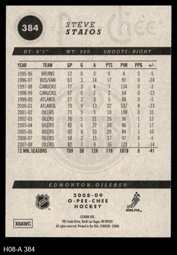 2008 O-Pee-Chee #384 Steve Staios 8 - NM/MT