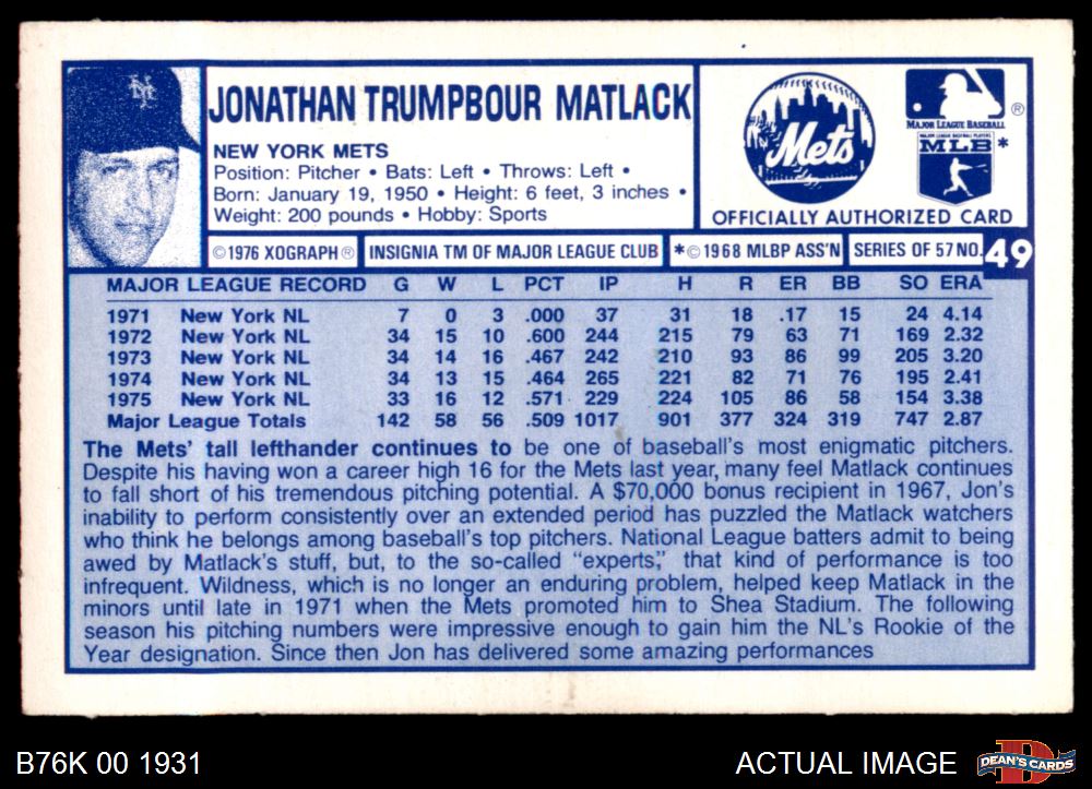 1976 Kellogg's #49 Jon Matlack 2 - GOOD